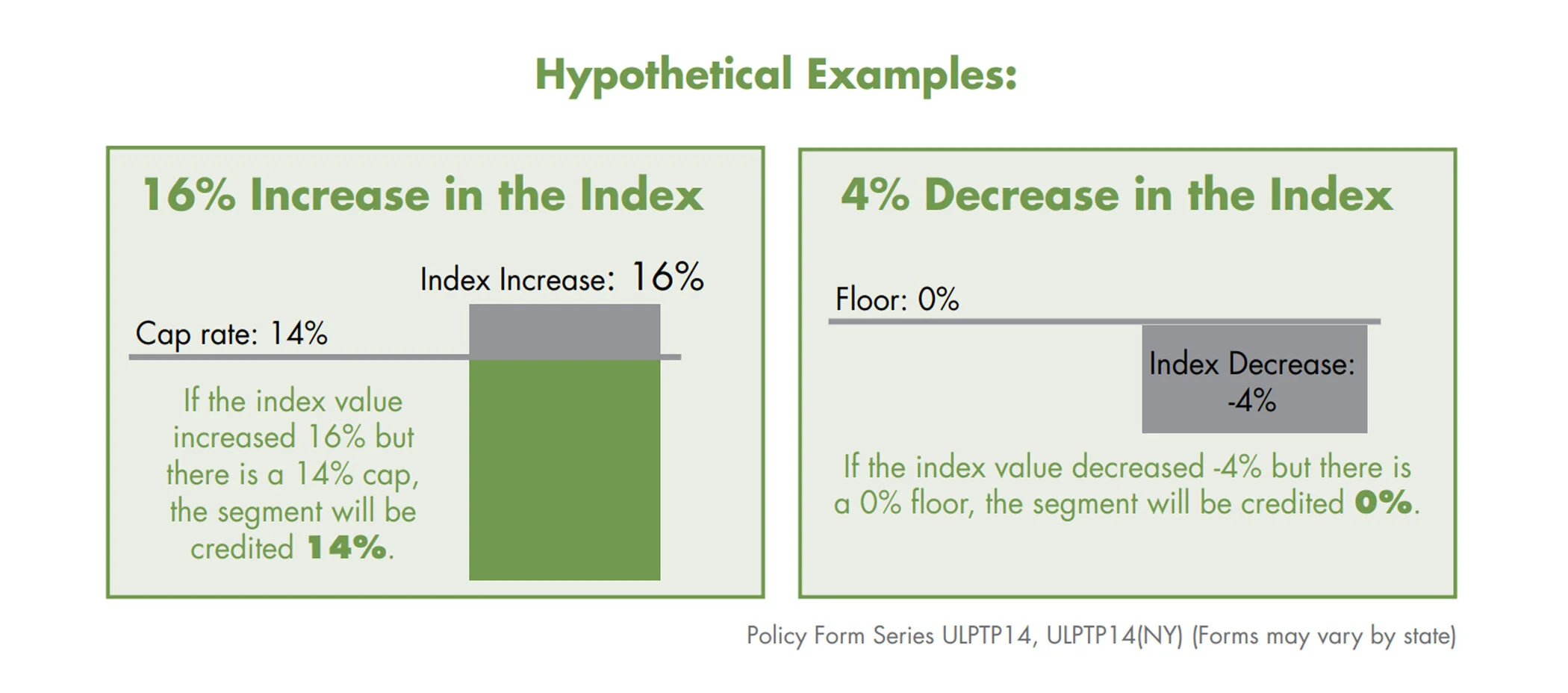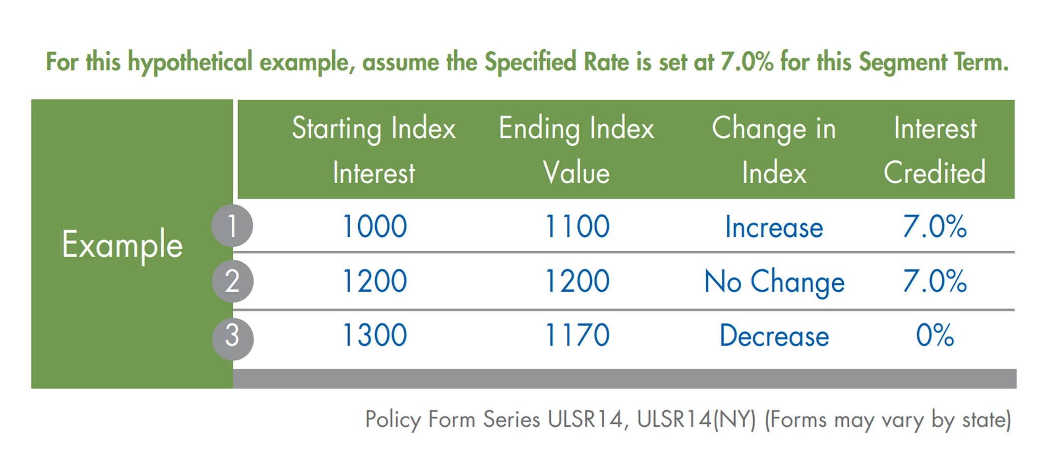 • If there is no change or a decrease in the value of the index, the value in this segment will be protected by the 0% floor and will receive no interest earnings.